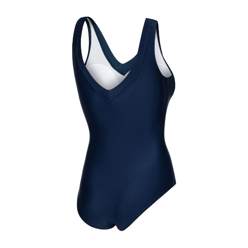 Baddräkt dam Sophie erbjuder ett stadigt support över bysten med tunna vadderade insydda Hela magpartiet har ett innefoder. Breda axelband som ger avlastning om bysten är lite större. Mörkblå bottenfärg med 3 blåa passportaler sydda diagonalt över baddräkten, dessa ger ett avsmalnande intryck. V-ringad frontparti samt V-ringat ryggparti.