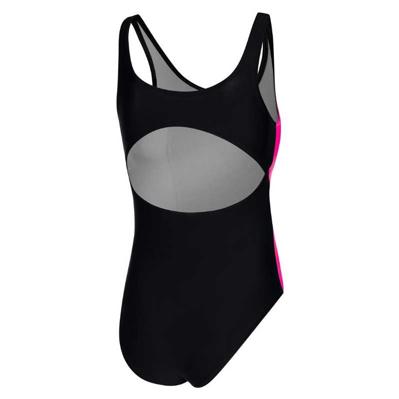 Baddräkt barn i tvåfälts mönster, Fint sydd med rosa partier på sidorna som vavslutas med en snygg rosa kant svart mot rosa.Ryggen har två färger. Silverfärgat tryckt logga på bröstet. Baddräkten har foder på hela framsidan. X-rygg som gör att banden sitter kvar och inte glider ner. Materialet töjer sig c,a 1 stl i vattnet. Tyget skyddar UPF 50+