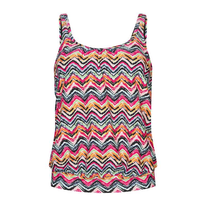 Tankinilinne i mönstrat i många färger från Wiki, ger en snygg look på stranden och badhuset. Är snygg att kombinera med en enfärgad trosa/kjol. Modellen är löst över magen och fångas upp av en bred kant nertill vid midjan. Stödet är över bysten har formpressade kupor, går inte att ta ur.