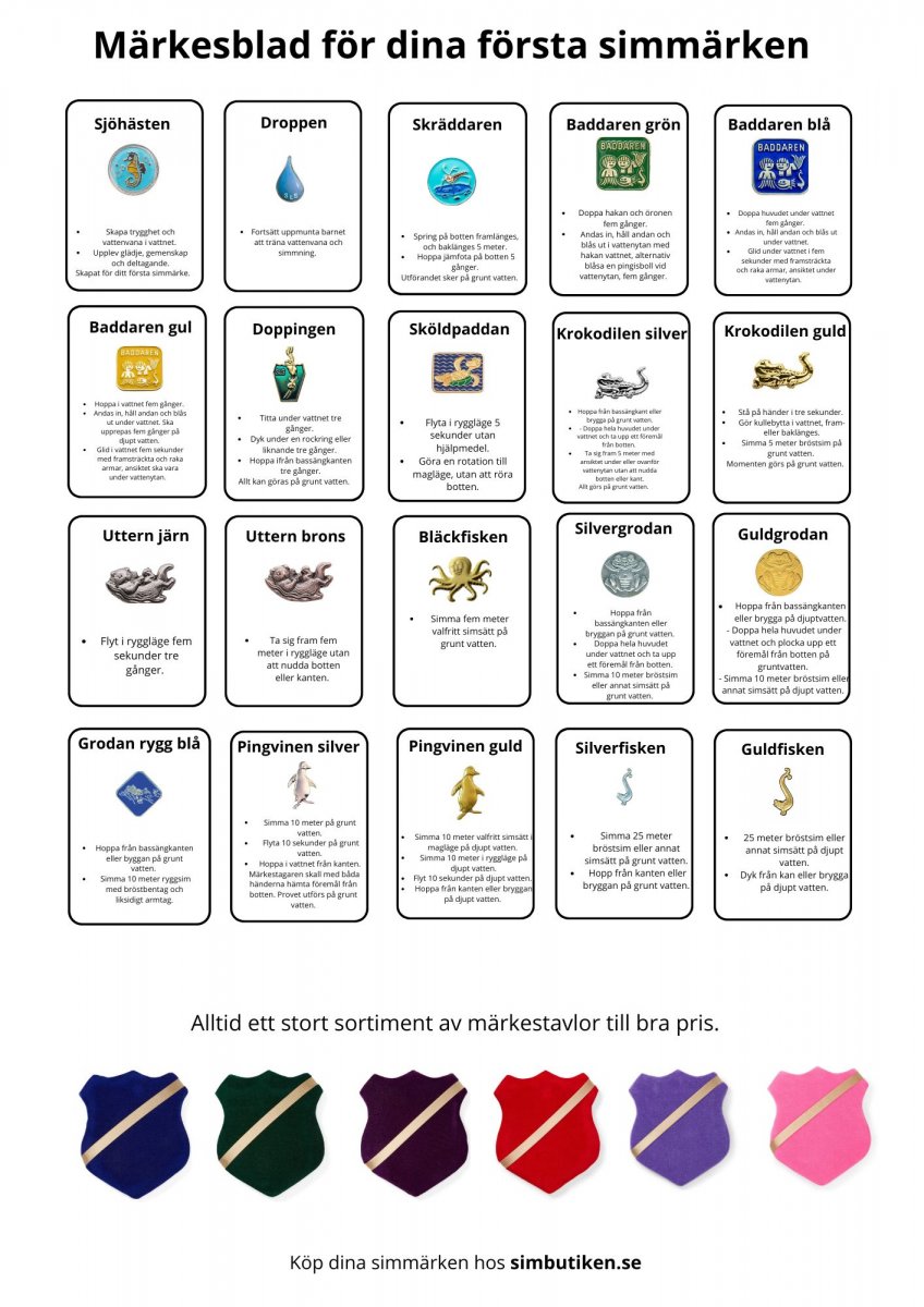 Simmärkesbladet är för dina första simmärken. Simmärkesbladet kan du enkelt ta med till poolen och läsa direkt vad du ska göra, vilket underlätter när du skall ta dina första simmärken. När du köper detta kommer det inplastat så det håller för att ha vid vattnet.