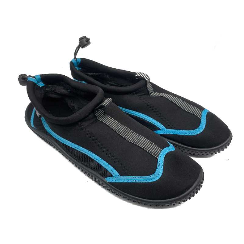 Snygga badskor från Soak i dubbelstorlekar. Badskorna har en dragsko i bak för att enkelt ta på och av dem. Ett smart band är insytt på ovansida för att hålla i och göra det lättare att sätta på badskon. Den mjuka gummisulan har små knoppar på undersidan för att leda bort vattnet. På sidorna sitter ett finmaskigt nät för att dränera badskon från vattnet samt inte ta in för mycket sand. En uttagbar sula gör att du kan lägga i en annan om önskemål finns.