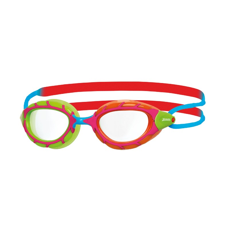 Simglasögon barn 6-14 år med tuffa färger från Zoggs. Listen runt ögonen är indelade i olika tjocklekar vilket gör att de formar sig fint runt ögat. Tvådelat band direkt från ramen och justering av storleken baktill. Multifärgad ram.