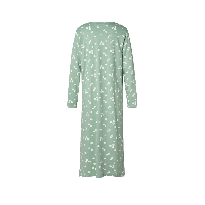 Ett grönt nattlinne med vita blommor. Nattlinnet har långa ärmar, v-formad hals och är lång i modellen. Det finns i storlekarna S-XXL. För en lösare passform rekommenderas att gå upp en storlek.